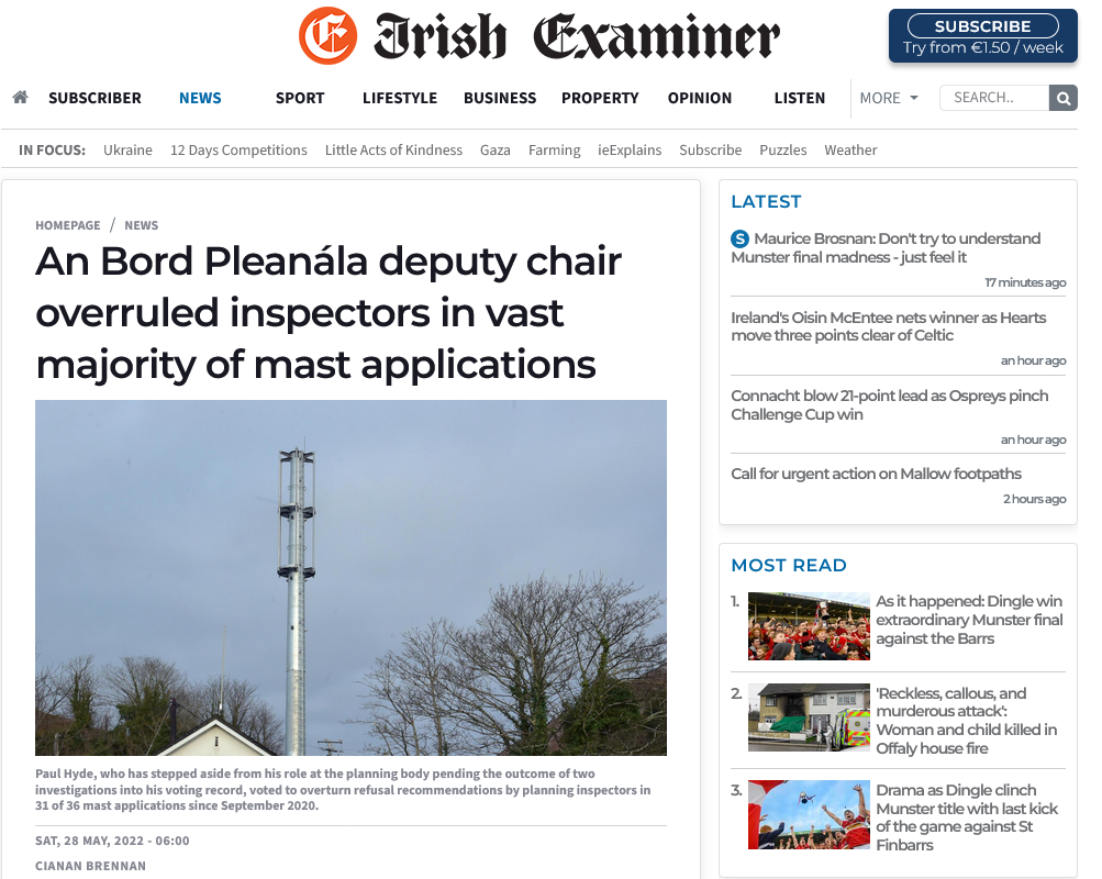 Mr Hyde granted permission for five communications structures in Cork against the opinions of his own inspectors. In one of those, an application by Vodafone for an 18m monopole in Innishannon, the inspector recommended refusal, stating the build would “seriously injure the visual amenities of the area” — an opinion flatly contradicted by Mr Hyde in his decision.