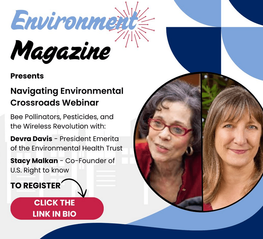 You’re invited to join Environmental Health Trust’s founder, Devra Davis, when she presents at the webinar Navigating Environmental Crossroads: Bee Pollinators, Pesticides, and the Wireless Revolution sponsored by Environment magazine publishers Taylor & Francis on March 26 at 5.00pm Ireland. The event, hosted on Zoom, is presented by University of California, Irvine.