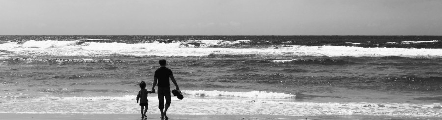 Father and son on the beach in spring time